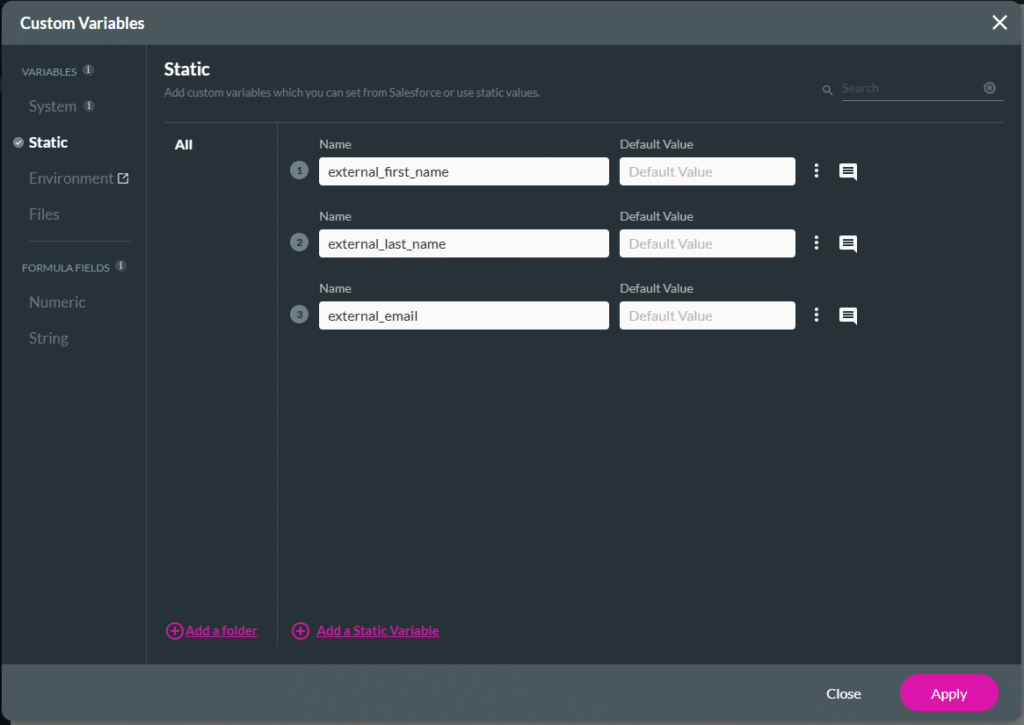 - Under Mapping, map the variables to the relevant Salesforce fields and click the Apply button. The Salesforce integration is added to the screen.