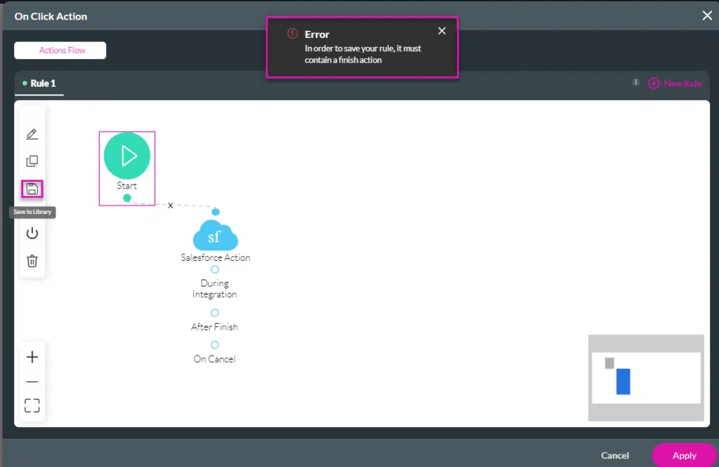 Remember to add a Finish node before attempting to save the rule.